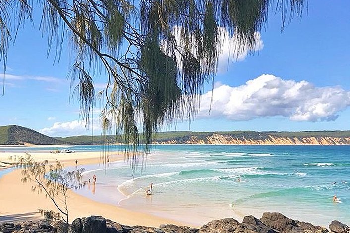 Experience the thrill of the Great Beach Drive passing the stunning famous Rainbow Beach coloured sand cliffs & arrive at surfing paradise, Double Island Point.